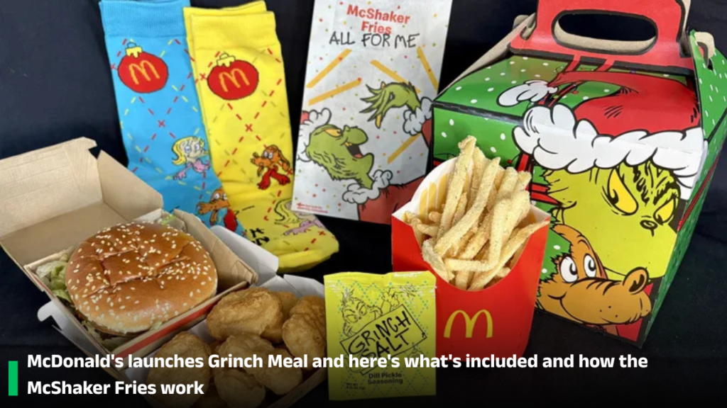 Starting December 2, McDonald’s is launching its Grinch Meal nationwide, which includes a Big Mac or a 10-piece Chicken McNuggets, Dill Pickle ‘Grinch Salt’ McShaker Fries, a medium drink, and a pair of vibrant Grinch-themed socks.