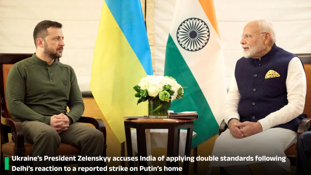 Ukraine’s President Zelenskyy accuses India of applying double standards following Delhi’s reaction to a reported strike on Putin’s home